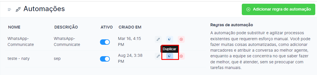 Para fazer uma cópia de uma automação existente, basta clicar no ícone deduplicar clonagem na lista de automações que deseja copiar. Isso criará uma réplica exata da automação com as mesmas condições e ações.