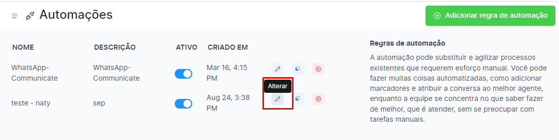 Para editar uma automação, clique no EditíconeAlterar da lista de automações que deseja editar.