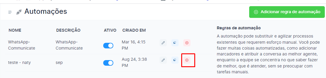 Para excluir uma automação, clique no botão excluir da lista, observe que isso é permanente e não pode ser desfeito.