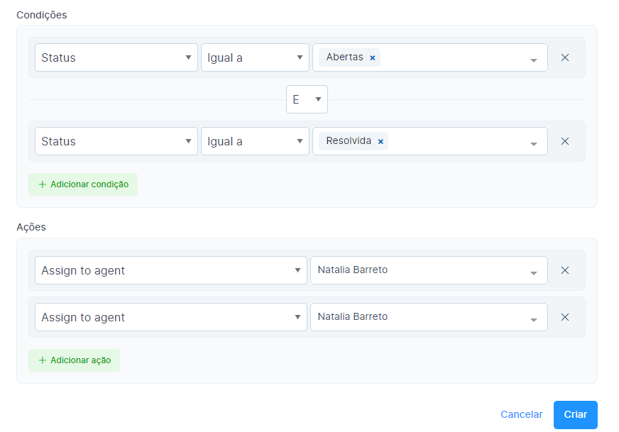 As condições são critérios que serão verificados antes da execução da ação. As condições são avaliadas na ordem em que são definidas.