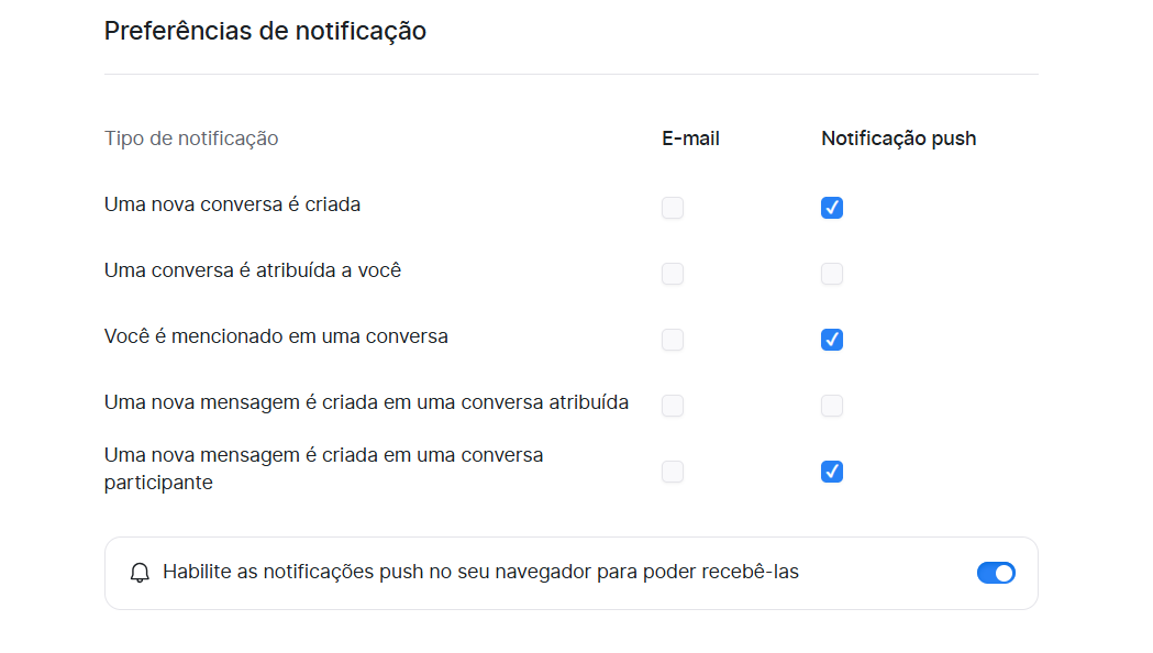 A coluna e-mail enviará uma mensagem no endereço de e-mail registrado na conta e a notificação push é a notificação que o navegadora fará para alertar o tipo de notificação descrito.