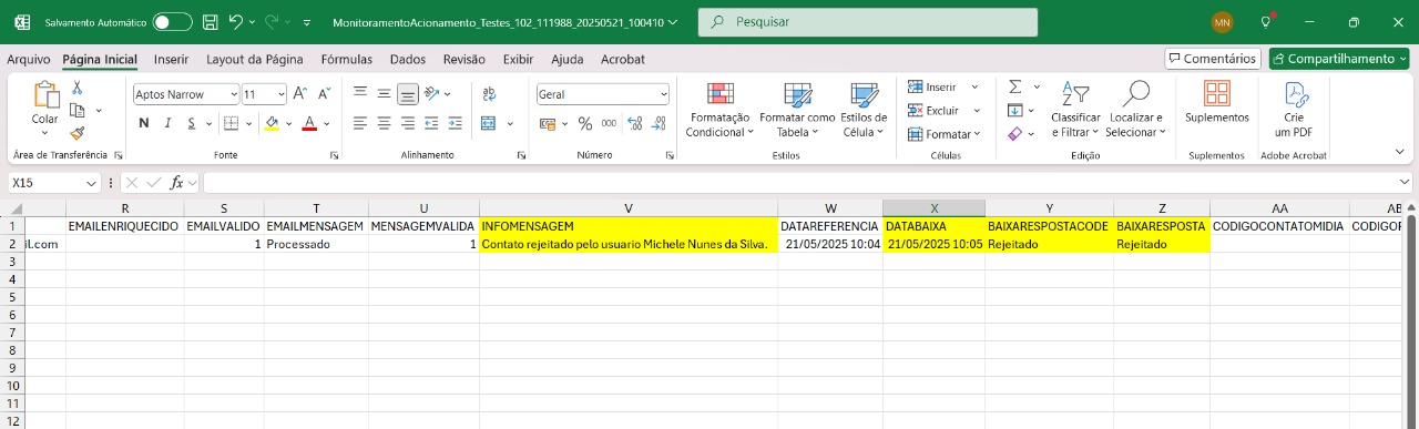 Neste relatório, as informações referentes à aprovação ou rejeição de contatos são registradas nas seguintes colunas: