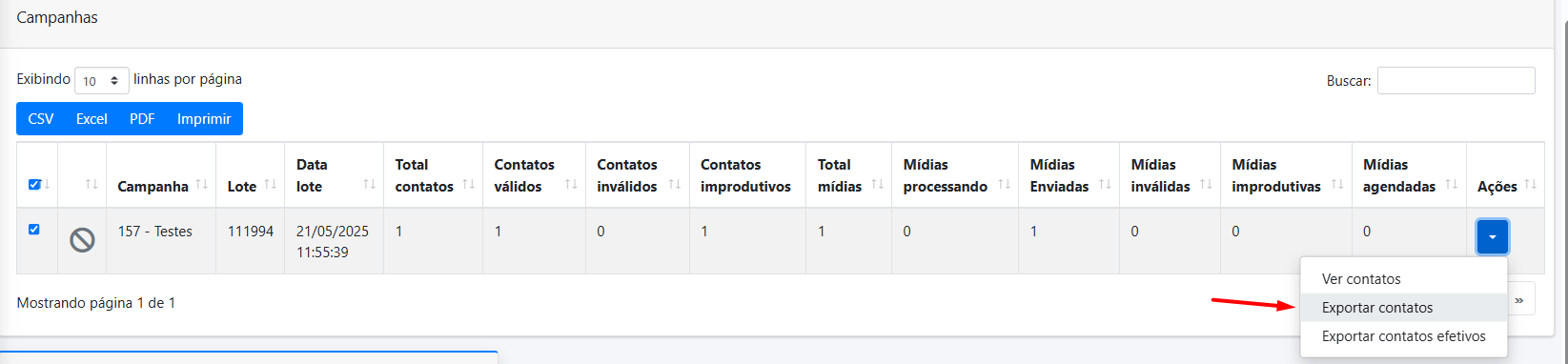 Na opção de exportar relatórios, dentro do menu Monitoramento > Campanhas, você poderá gerar os dados da sua campanha.