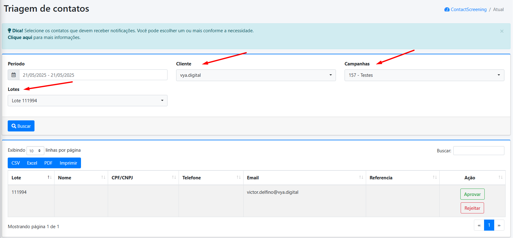 Neste campo, você terá duas opções: aprovar ou rejeitar o contato importado para a sua campanha.