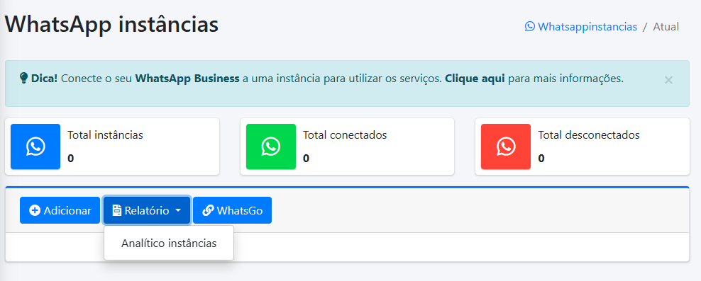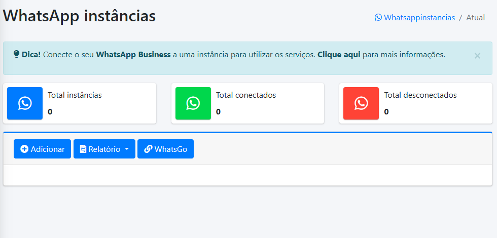 Ao clicar no botão para visualizar uma instância específica (símbolo de olho), uma nova tela será exibida. Caso sua instância ainda não esteja conectada a nenhum dispositivo do "WhatsApp Business", haverá uma opção para gerar o QRCode. Clique no botão "Conectar" e, após a geração do QRCode, basta escaneá-lo com seu smartphone para conectar-se à instância. Assim que conectado, sua instância estará vinculada e você poderá usar os serviços disponíveis do "WhatsApp Instâncias".