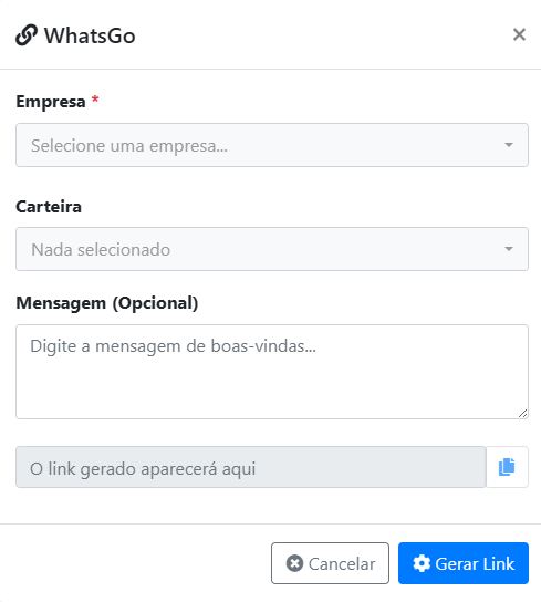 Ao clicar no botão WhatsGo, uma tela (imagem abaixo) aparecerá para que sejam preenchidos os dados necessários para gerar o link.