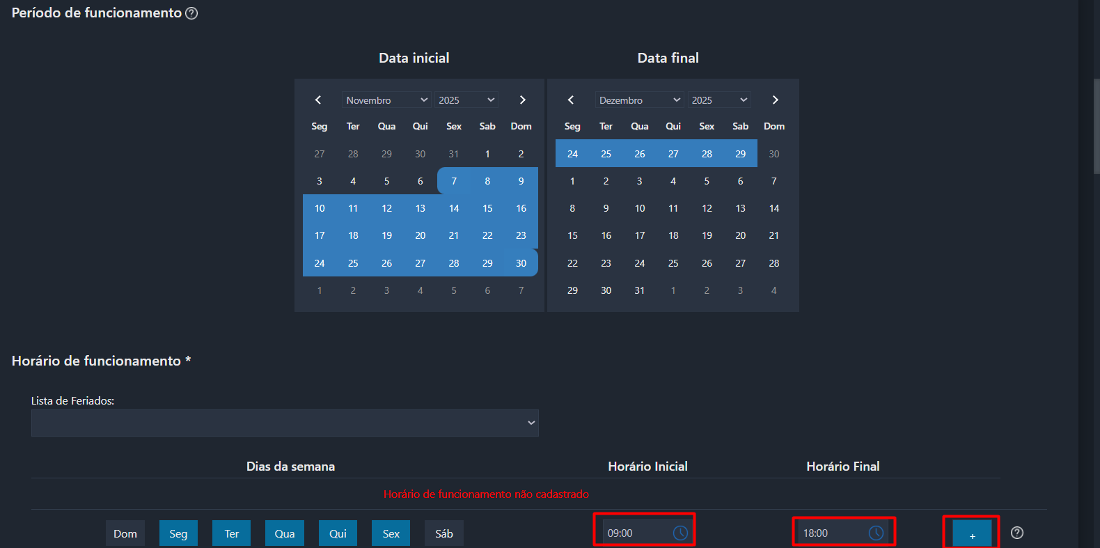 Importante: No calendário visível acima, selecione a data em que a campanha estará ativa para operação. No horário de funcionamento, você pode selecionar o horário inicial e demarcar o período desejado. Após a seleção dos dias e horário, clique no botão "+" para salvar.