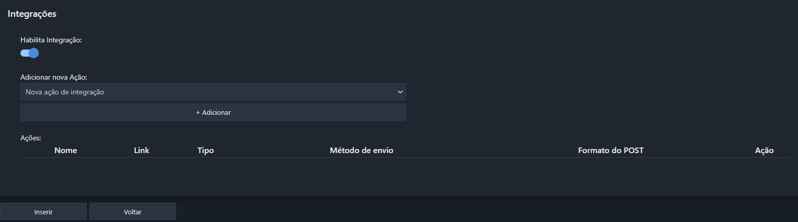 A seção de integrações possibilita disparar informações para um endpoint via POST para registrar dados.