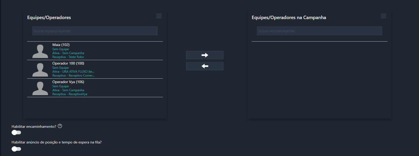 - Operador 100 (100): Sem campanha, ATIVO FLUXO, Receptiva - Mensagem Conta...