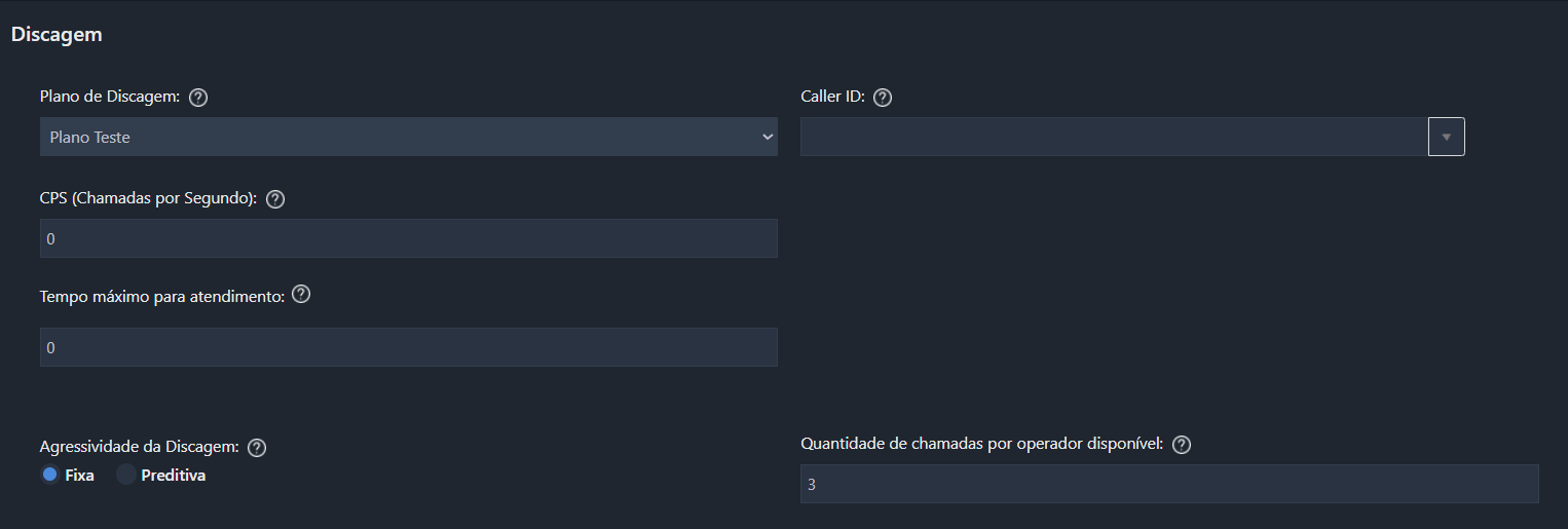 - Plano de Discagem: Dropdown para selecionar o tronco configurado para realizar o envio das ligações (nosso lado)