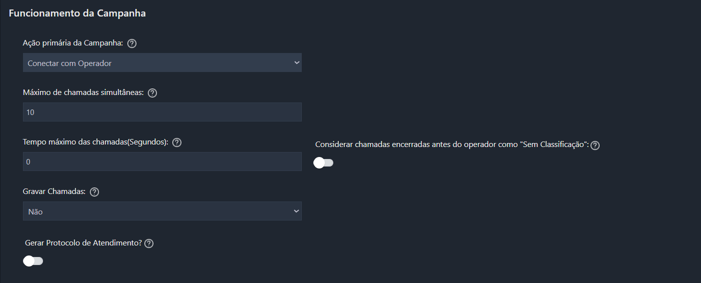 - Tempo de toque antes de passar para próximo operador (ex: 15 segundos)