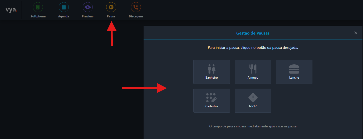 ⚠️ Atenção: O tempo de pausa começa a ser contado imediatamente após você clicar no botão do motivo. Para voltar finalize a pausa no mesmo menu.
