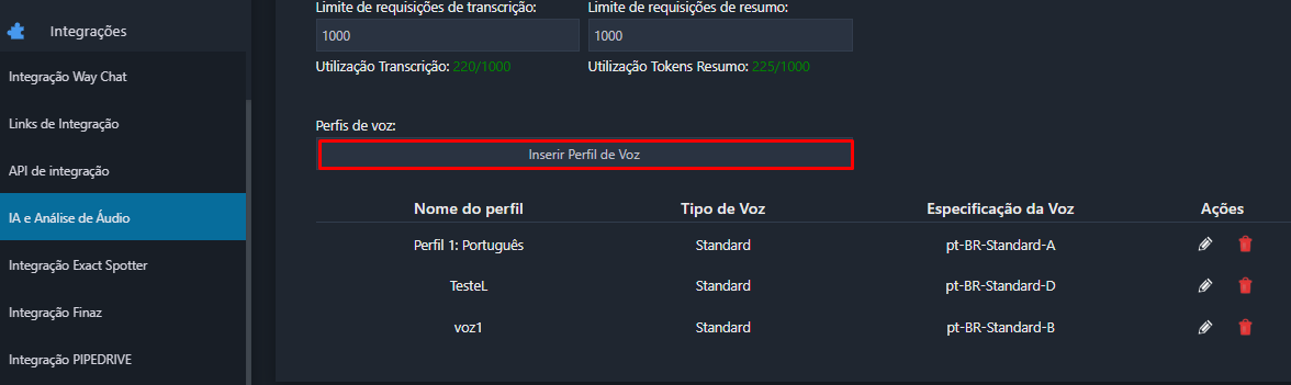 Acesse o grupamento de integrações e a tela de "IA e analise de áudio" (Pode ser que em seu painel esteja inserido como "Integração de Áudio)
